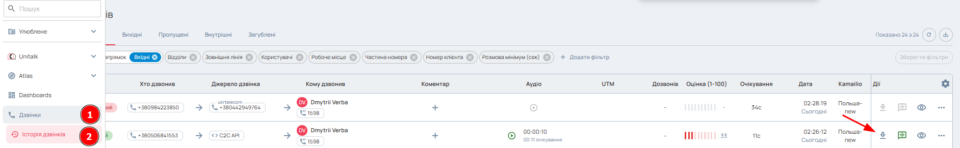 - Заходимо в історію дзвінків UniTalk та завантажуємо на ПК запис цього дзвінка.