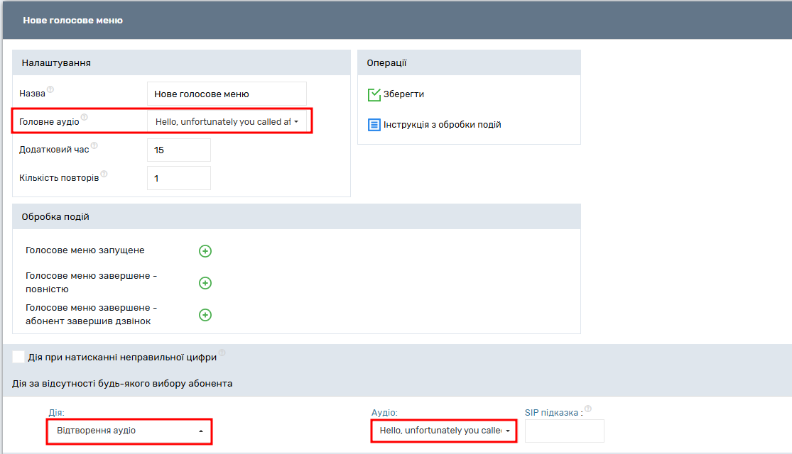 5. Виберіть дію за відсутності будь-якого вибору абонента, а саме – Відтворення голосового повідомлення та виберіть той самий запис, що і в Аудіо – основне. Це потрібно для того, щоб людина не прослухавши або не зрозумівши з першого разу, почув той самий запис і таки зробив вибір з яким відділом йому краще обговорити своє питання.