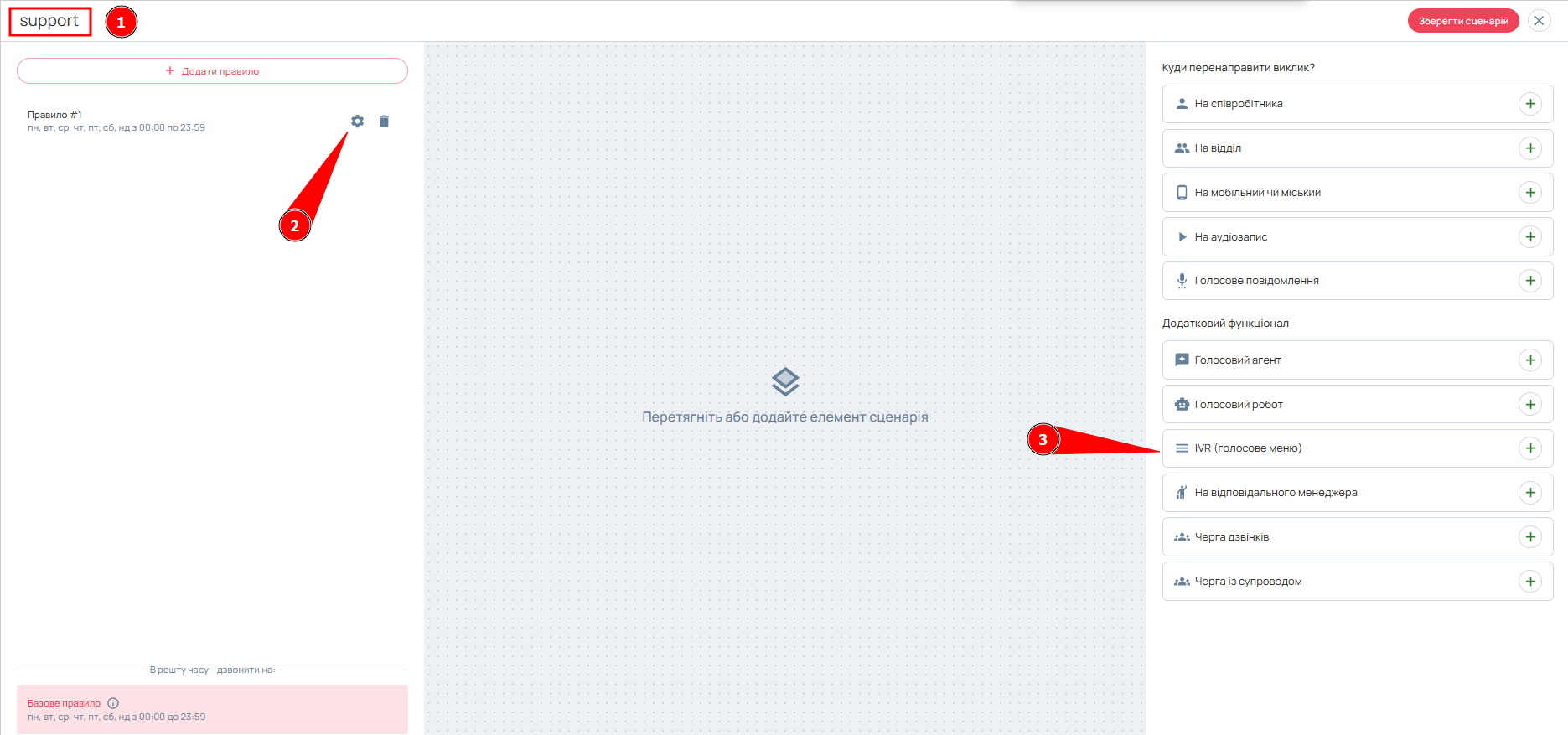 У свіжо-створеному правилі вказуємо назву, робочий графік, якщо він потрібен і перетягуємо натиснутою лівою кнопкою миші блок “IVR (голосове меню)”.