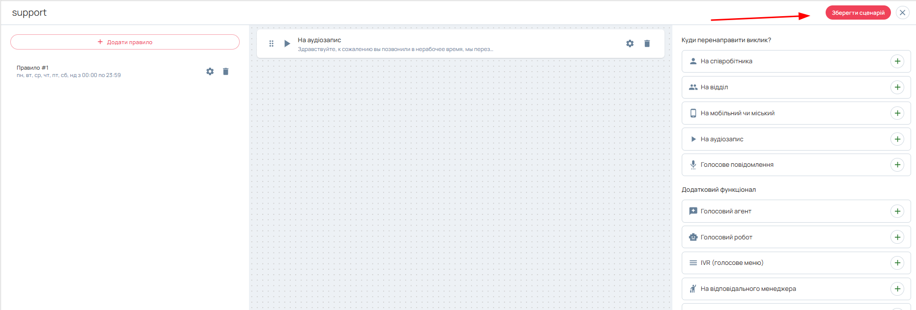 Актуально, якщо графік НЕ 24/7. У базовому правилі вказуємо дію, яке потрібно буде виконувати у весь час, крім зазначеного в правилі “Робочий час”. Наприклад, включення запису з бібліотеки UniTalk – “Здрастуйте, на жаль, ви зателефонували у неробочий час, ми передзвонимо вам на початку робочого дня. Дякую за звернення.”.
