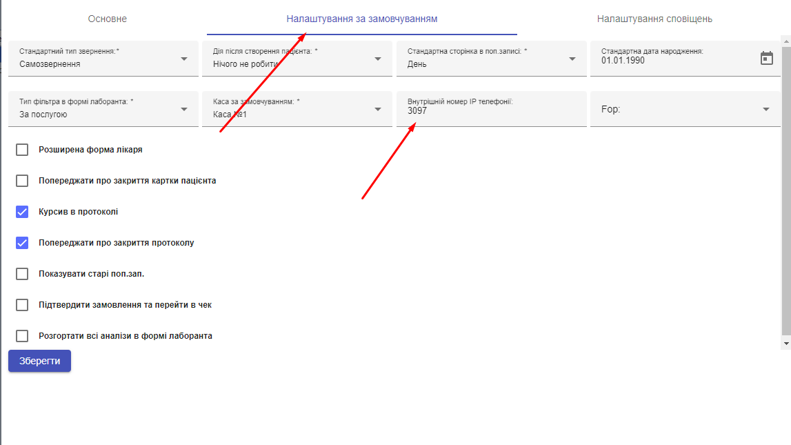 4. Додати внутрішній номер SIP лінії, для того щоб телефонувати напряму із Clinica Web:
