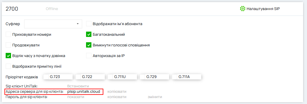 2. Увійдіть у додаток, дайте йому всі необхідні дозволи. Введіть дані, які можна знайти в особистому кабінеті UniTalk, у вкладці “Користувачі”. У полі “SIP логін” вставте свій номер лінії, далі пароль (щоб побачити пароль, натисніть нижню кнопку “Налаштування” біля вашого користувача в особистому кабінеті) та SIP сервер – plsip.unitalk.cloud (як вказано в установках SIP лінії на вкладці Користувачі)