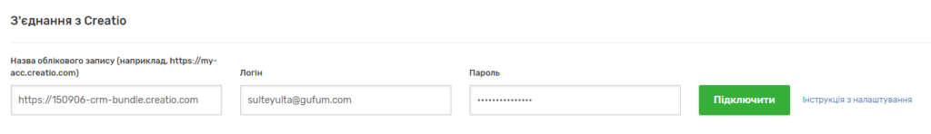 - У кабінеті UniTalk відкрийте пункт меню Інтеграція – Creatio. Або ж перейдіть за посиланням. Введіть назву акаунта, логін і пароль. Натисніть кнопку «Підключити».