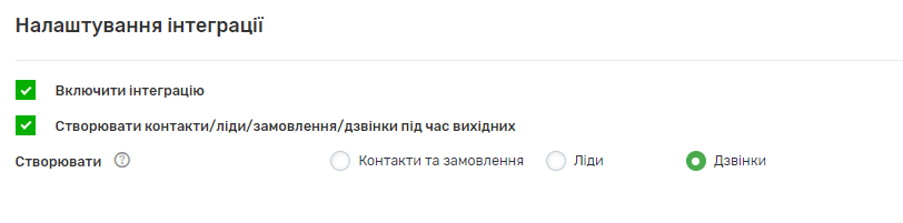 Якщо Ви хочете, щоб картки клієнтів створювалися не тільки під час вхідних дзвінків, а й під час вихідних, то увімкніть налаштування «Створювати контакти/ліди/замовлення під час вихідних».