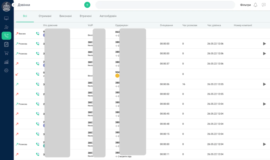 Підключення та налаштування інтеграції завершено. Інформація про дзвінки передаються в KeepinCRM і може бути переглянута на сторінці “Дзвінки” (Мал. 28).
