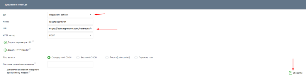 6. У блоці “Додавання нової дії” ввести бажану назву в поле “Назва” і вставити в поле “URL” посилання на вебхук, скопійоване в пункті 4 (Мал. 23);