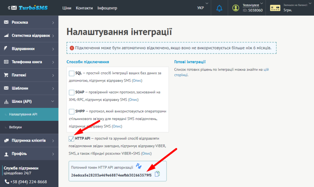 API ключ: Перейдіть в розділ “Шлюз (API)”, далі в “Настройки API”. Увімкніть опцію “HTTP API” і скопіюйте поточний токен для авторизації.