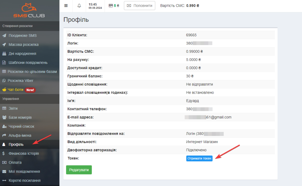 Налаштування SMS Club