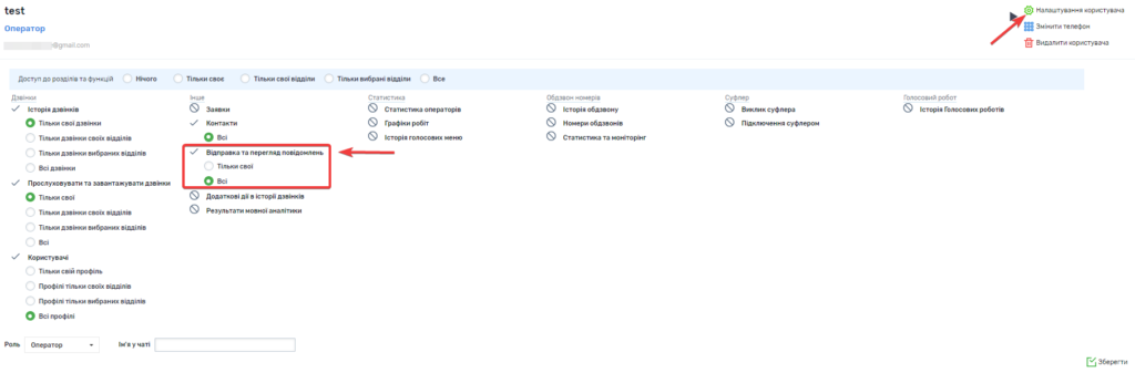 На сторінці користувачів можна обмежити можливість відправки повідомлень, перегляду історії повідомлень та повідомлень всіх користувачів для операторів і менеджерів.