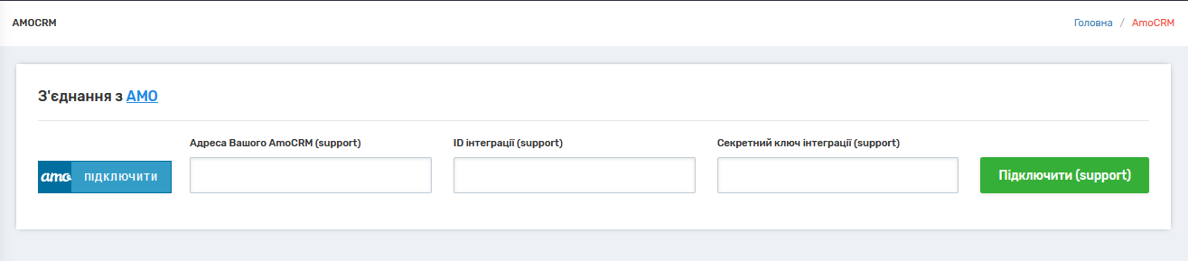 1. У кабінеті UniTalk перейдіть до пункту меню Інтеграція – AmoCRM. Натисніть кнопку “amo підключити”.