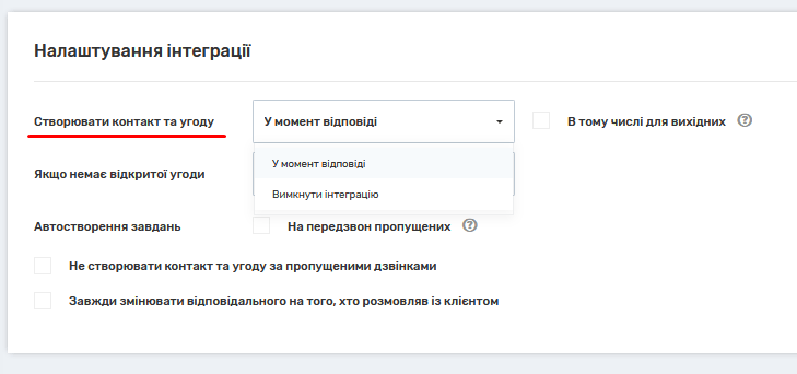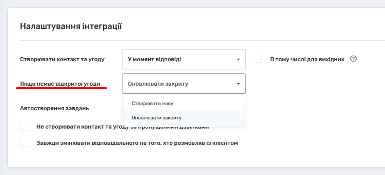 Створювати нову – якщо немає відкритої угоди, AmoCRM створює нову угоду і в неї записується дзвінок.