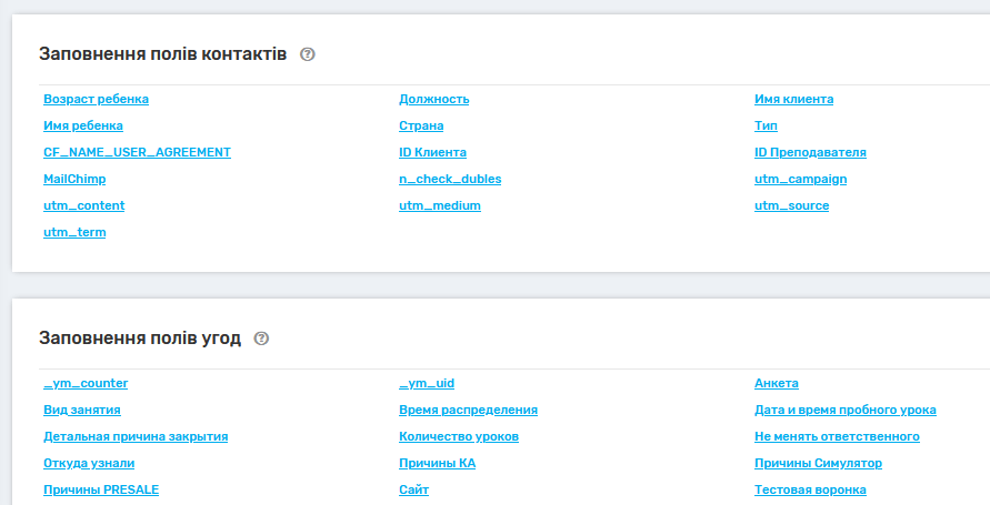 10. У налаштуваннях «Заповнення полів контактів» та «Заповнення полів угод» можна вказати, які дані надсилатимуться з кабінету UniTalk до кабінету AmoCRM.