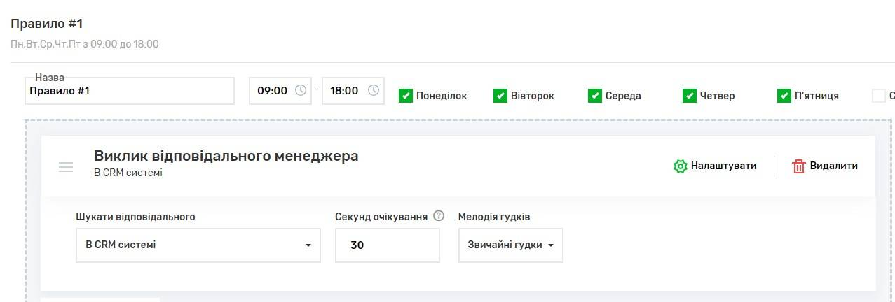 Для пропущених дзвінків можна вибирати відповідальних співробітників залежно від джерела дзвінка, дня тижня та проміжку часу. Можна вибирати випадкового відповідального з групи співробітників.