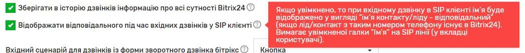 Під час вхідних дзвінків у SIP-клієнті ім’я того, хто телефонує, буде відображатися як “ім’я ліда/контакту – відповідальний”, якщо лід/контакт з таким номером телефону існує в Bitrix24.