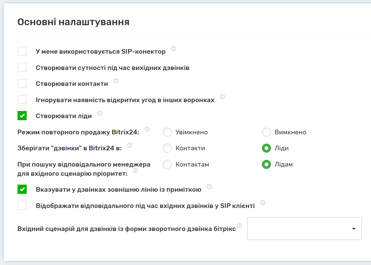 Можна встановити сценарій, за яким будуть здійснюватися дзвінки з форм зворотного зв’язку Bitrix24.