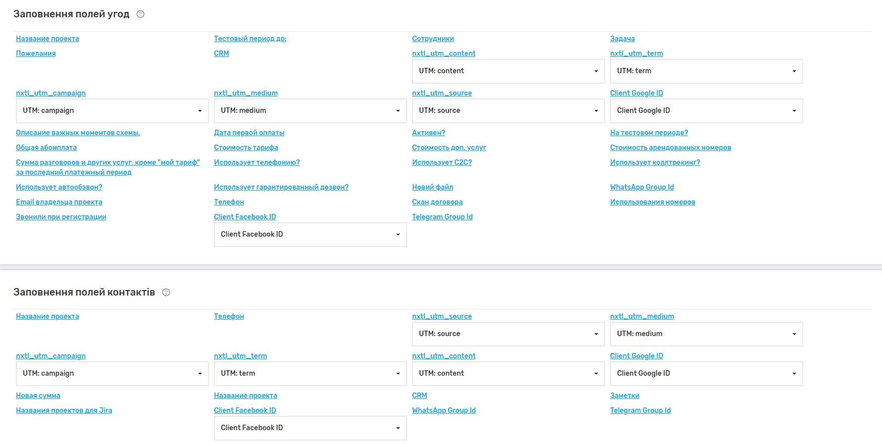Якщо надходить Call Tracking або дзвінок з кнопки зворотного зв’язку, то при створенні карток ліда, контакту і угоди можуть передаватись дані конверсії: utm-мітки (utm_source, utm_medium, utm_campaign, utm_term, utm_content), Client Google ID, номер візиту RoiStat, номер, на який зателефонував клієнт або ваше власне значення.