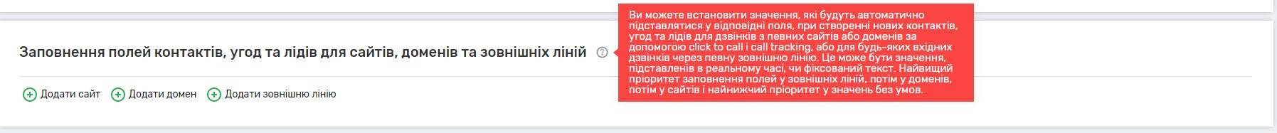 Також можливі варіації передаваних даних, залежно від джерела дзвінка. Поля контактів, угод або лідів заповнюються в порядку пріоритету, залежно від зовнішньої лінії, на яку надійшов дзвінок, або залежно від домену сайту, з якого був здійснений дзвінок. Найнижчий пріоритет мають значення без умов.