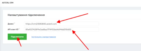 - АРІ ключ — для його отримання зверніться до техпідтримки Asteril CRM