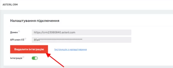 Для того, щоб відключити інтеграцію UniTalk з Asteril CRM, натисніть на кнопку “Видалити інтеграцію” та підтвердіть вибір.
