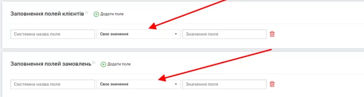 У значеннях можна вказати статичне або динамічне значення. Динамічне значення можна отримувати за допомогою засобів вибору з попередньо встановлених параметрів типу “Посилання на чат” або “Client google id”. Також, можна зчитувати поле користувача заповненим клієнтом через форму користувача. У налаштуваннях інтеграції вказується безпосередньо поле користувача.