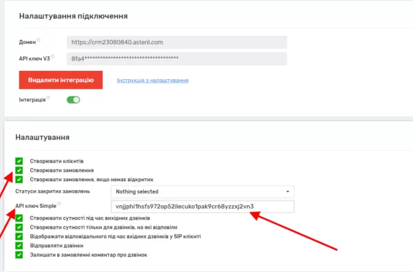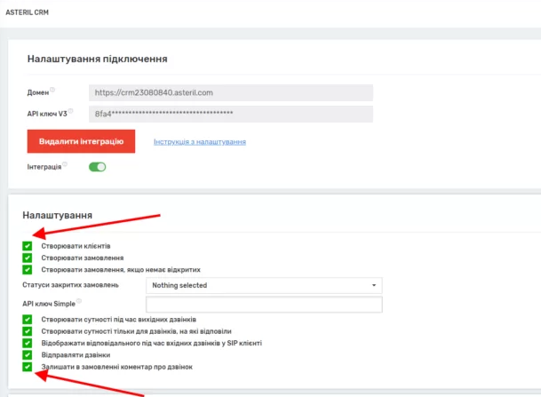 2. В особистому кабінеті UniTalk знову перейдіть у розділ інтеграції з Asteril CRM. В розділі “Налаштування” увімкніть галочки: