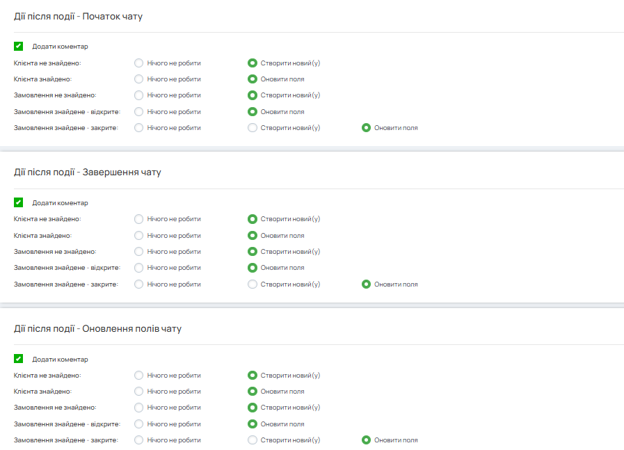 У блоці “Налаштування для чатів” для кожної з подій чату вкажіть, чи потрібно додавати коментар та які дії в яких випадках виконувати з суттю.