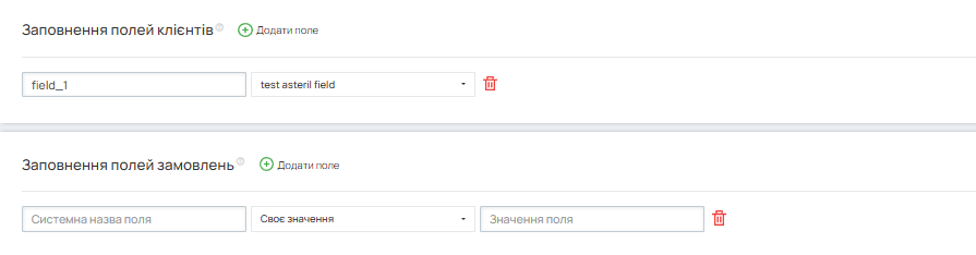Заповніть поля сутностей, які будуть заповнюватися даними з UniTalk під час створення. Системна назва поля повинна співпадати з системною назвою поля Asteril.