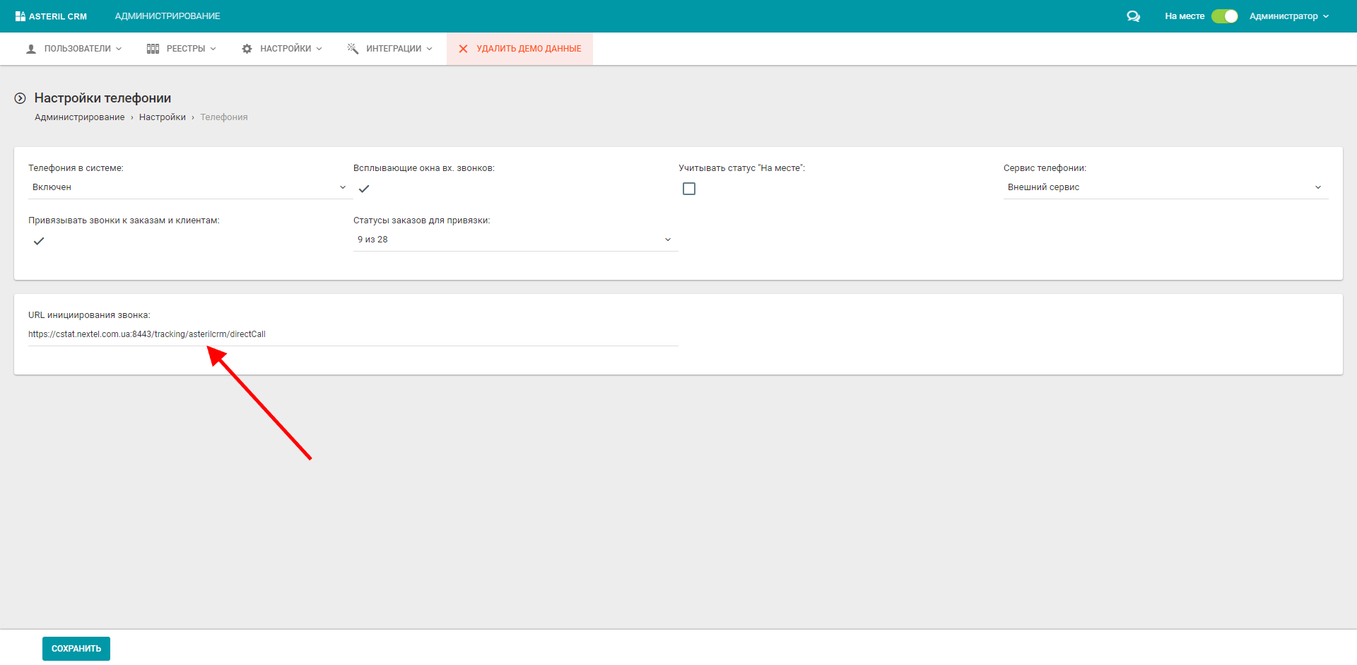 1. Для налаштування дзвінків за кліком в особистому кабінеті Asteril CRM у розділі “Адміністрування/інтеграція/телефонія” у поле “URL ініціювання дзвінка” введіть значення https://sip.unitalk.cloud:8443/tracking/asterilcrm/directCall. Натисніть кнопку “Зберегти”.
