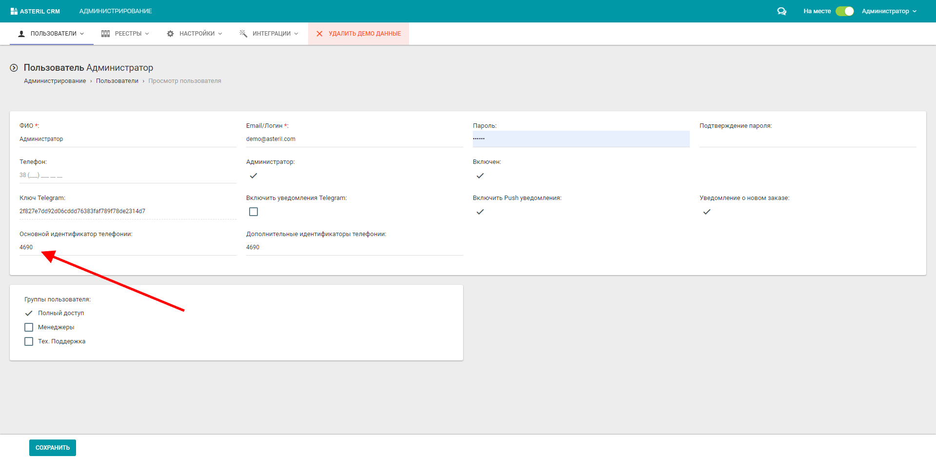 2. Щоб налаштувати здійснення вихідного дзвінка з CRM на телефонний номер клієнта за кліком в налаштуваннях кожного користувача у розділі “Адміністрування/інтеграція/телефонія” у полі “Основний ідентифікатор телефонії” вкажіть SIP-номер та натисніть кнопку “Зберегти”.