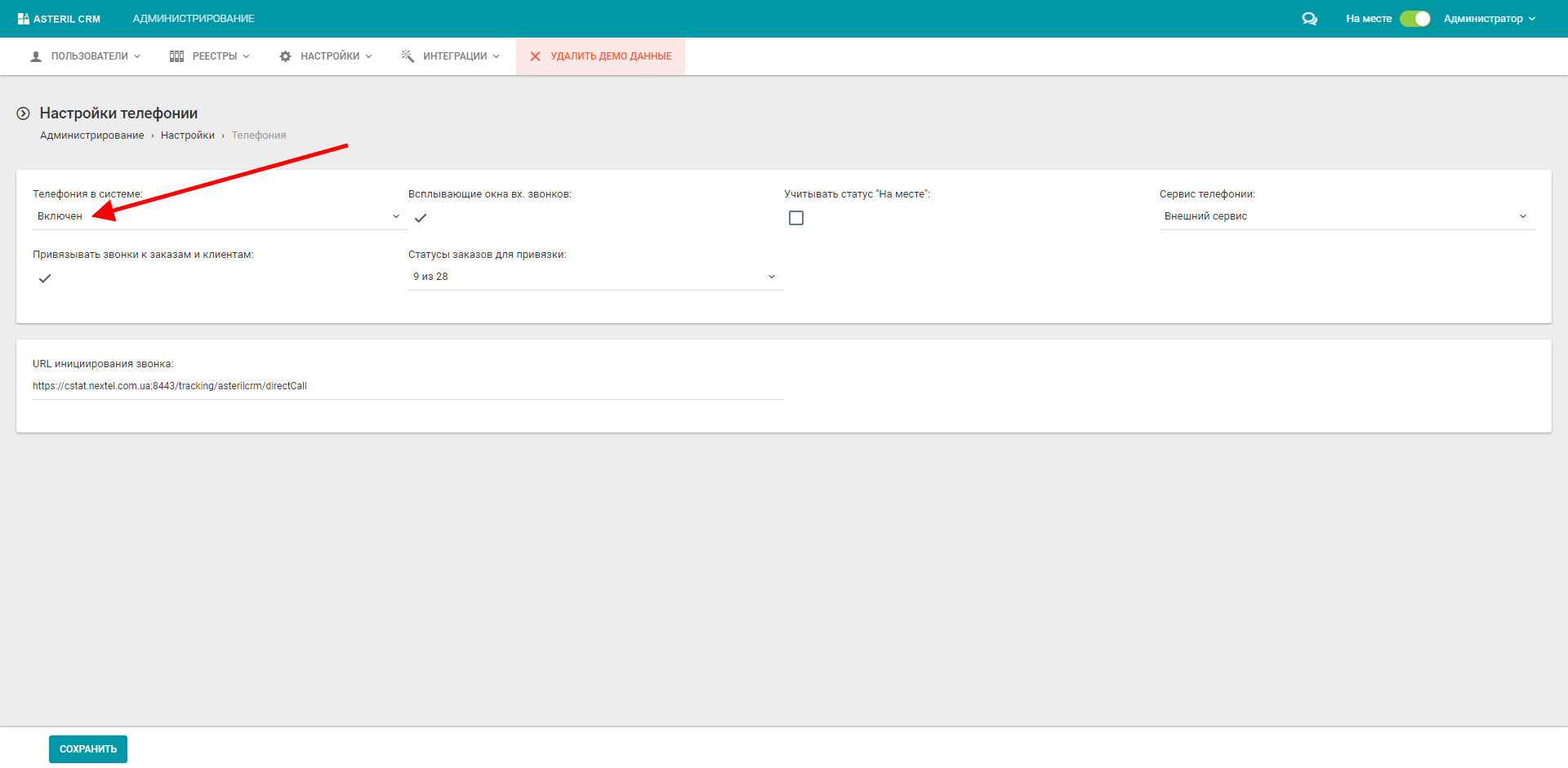 Функція “Відправляти дзвінки” вмикається для внесення інформації в CRM-систему про здійснені дзвінки. Для того, щоб інформація про дзвінки відображалась в особистому кабінеті Asteril CRM, у розділі “Адміністрування/Інтеграції/Телефонія” в випадаючому списку виберіть “Увімкнений”.