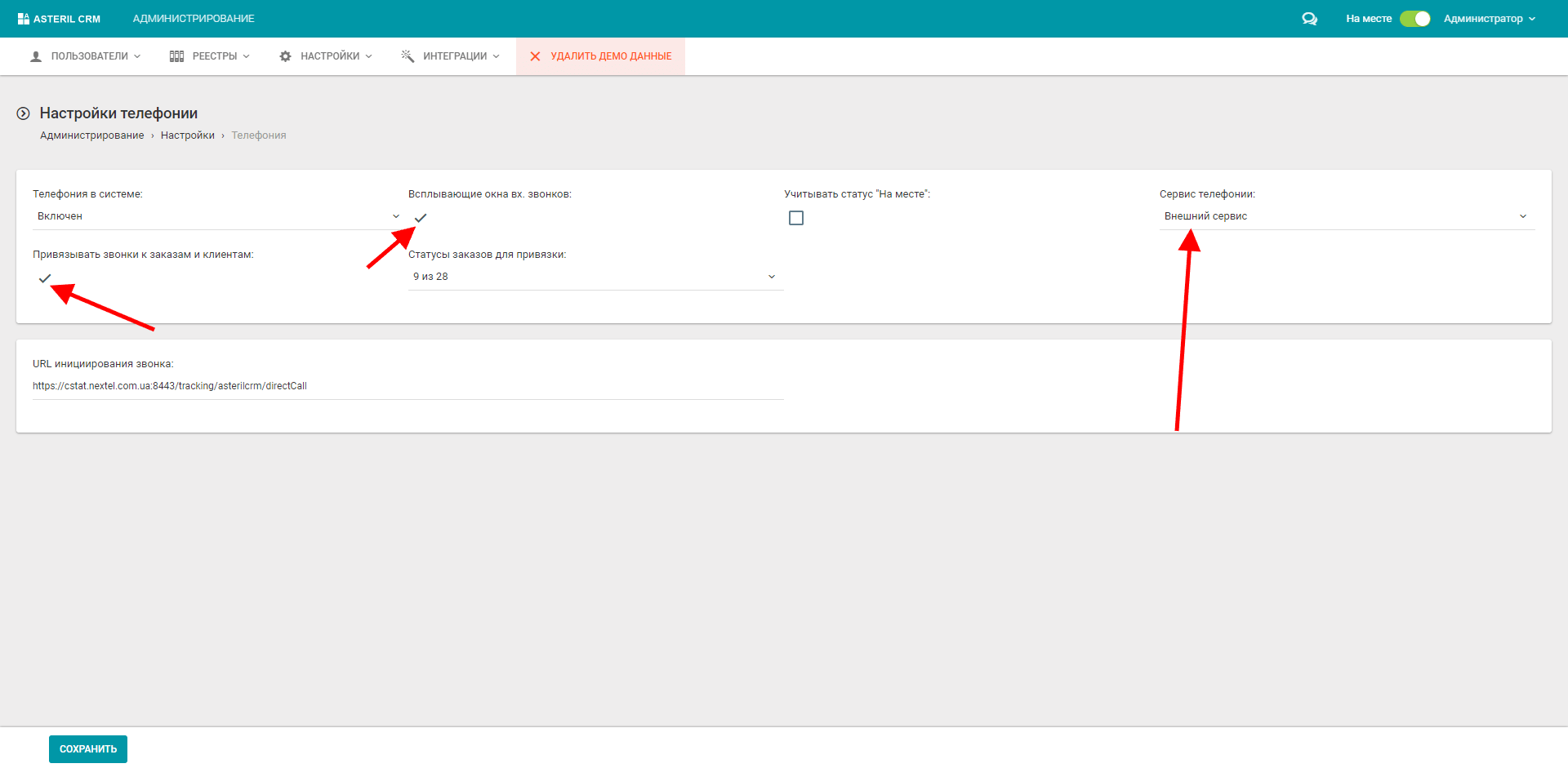 2. В особистому кабінеті UniTalk знову перейдіть у розділ інтеграції з Asteril CRM. В розділі “Налаштування” увімкніть галочки: