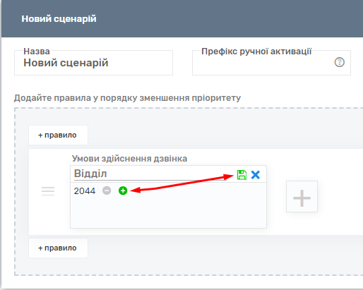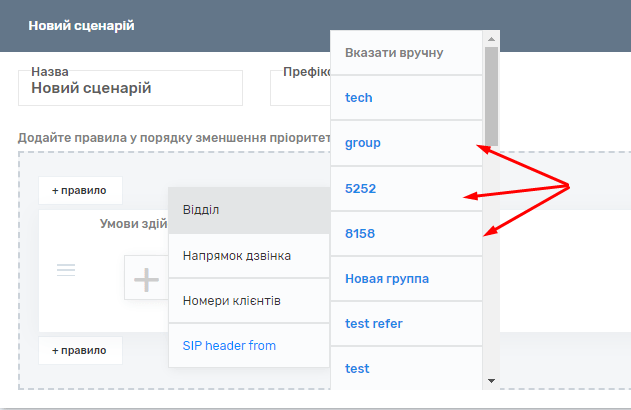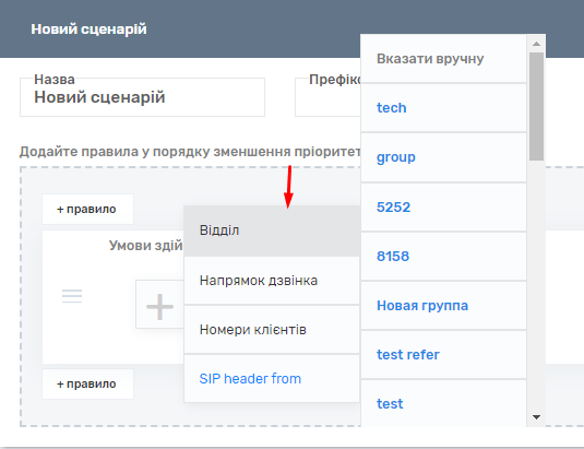 Для цього потрібно натиснути на «+ правило» і вибрати відділ, де у списку ви зможете вибрати один з раніше створених відділів, і вказати його як умови для дзвінка.