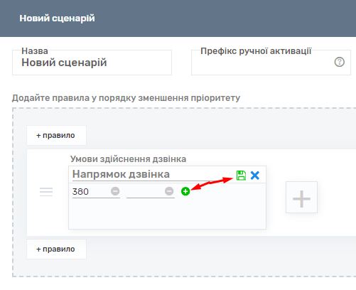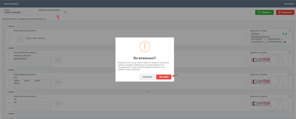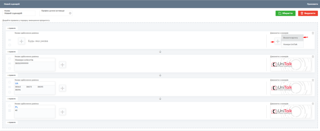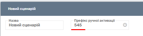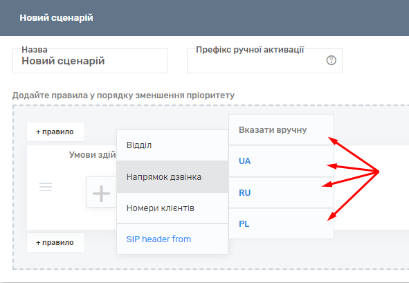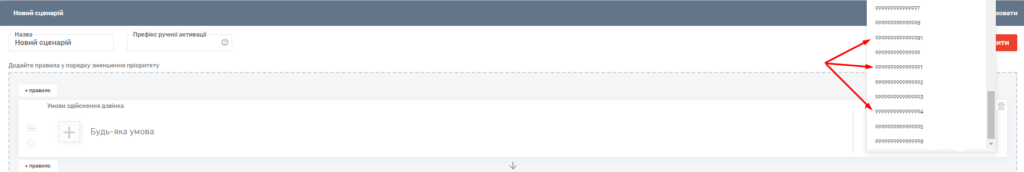 Також у вихідних сценаріях можна вказати префікс для ручної активації дзвінка. Ця послуга дозволяє дзвонити з певного сценарію, ігноруючи активний сценарій, за вказівкою цифрового префікса (від трьох цифр, наприклад, 545 + номер клієнта).