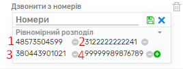 – Рівномірне розподілення: Дзвінки будуть здійснюватися з номерів рівномірно по порядку. Дзвінок буде здійснюватись таким чином: спочатку дзвінок піде з першого номера, наступний дзвінок піде з другого номера, і далі кожен дзвінок буде здійснюватись з наступного номера у списку.