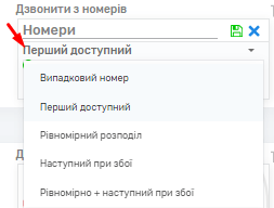 – Перший доступний: Дзвінок буде здійснюватися з номера, який доступний для дзвінка, якщо за номером зараз говорить менеджер, то системою вибереться номер вільний без розмови та з доступним каналом для здійснення дзвінка.