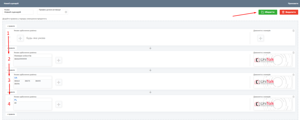 При створенні сценарію він стає активним, і такий сценарій є пріоритетним. Сценарії на яких немає мітки «Активний» ігноруватимуться під час прямого вихідного дзвінка.