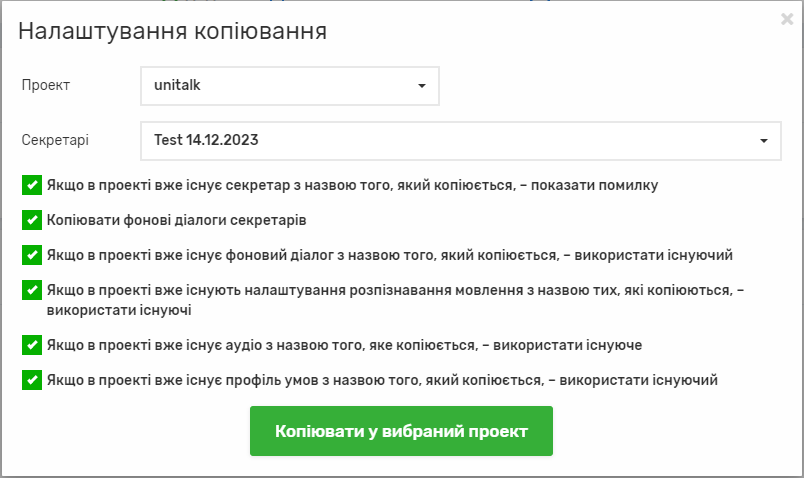 - увімкнено — замість копіювання налаштувань розпізнавання мовлення, в налаштування скопійованих роботів будуть підставлені існуючі в цільовому проєкті налаштування з назвами, які співпадають