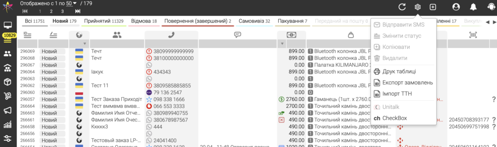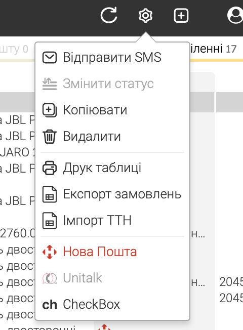 Перейдіть до розділу Замовлення – Перелік. Виділяйте потрібні замовлення. Натискайте на Шестирник у правому верхньому куті та зі списку вибирайте Unitalk.