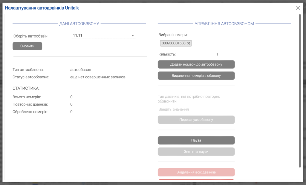 У вікні що відкриється ви зможете взаємодіяти з автообзвону.