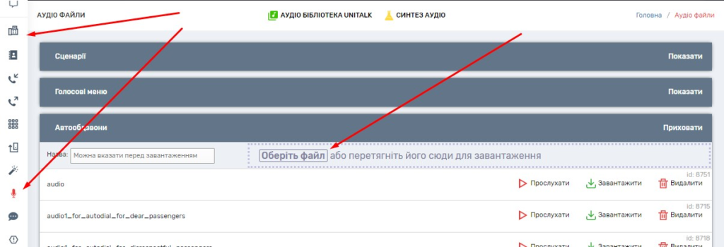 Переходимо в розділ IP-телефонія – Аудіо файли та завантажуємо запис в блок “Автообдзвон”.