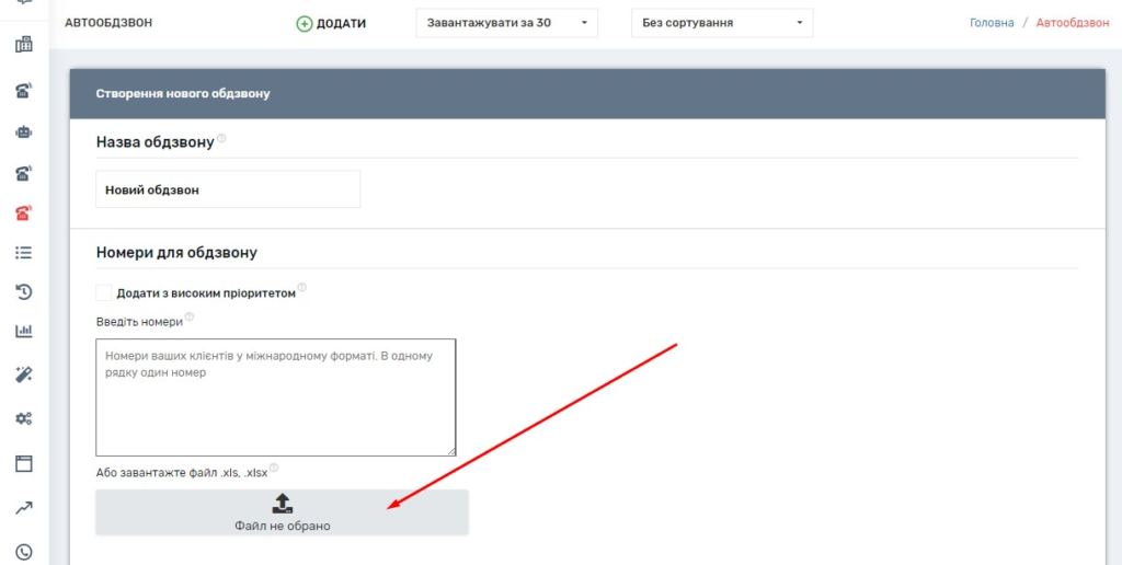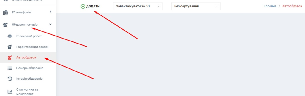 Переходимо в розділ Автообдзвон та натискаємо “Додати”.