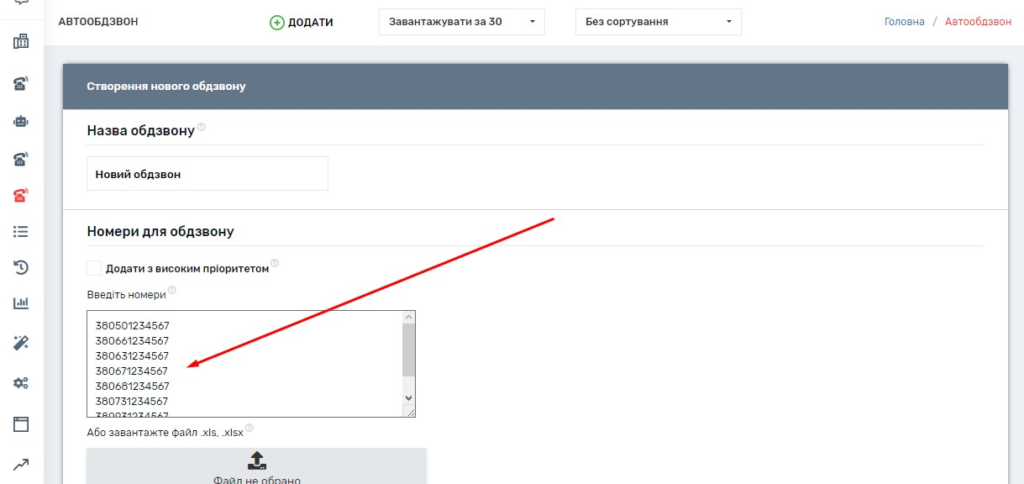 Контакти можна додавати з пріоритетом або без нього. Якщо включити настройку “З високим пріоритетом” і після цього завантажити список номерів, то всі номери з цього списку будуть пріоритетні та зателефоновані у першу чергу. Якщо додати номери, не включаючи настройку “З високим пріоритетом”, вони будуть додані в кінець списку.