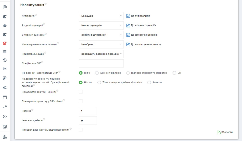 - Потоків. Кількість паралельних дзвінків. Встановлюйте значення залежно від багатоканальності ліній та кількості вільних операторів.