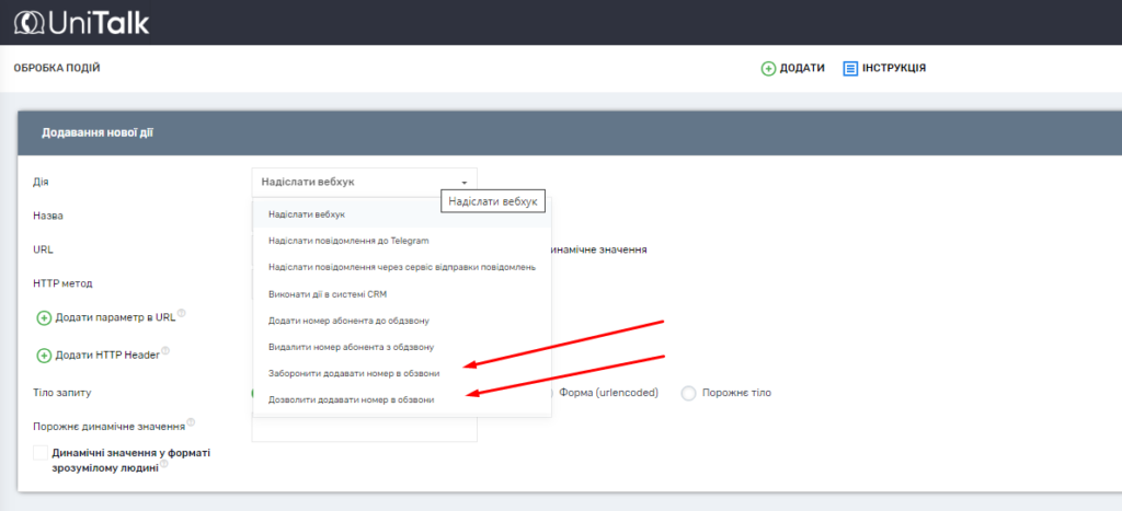 Також, крім ручного способу додавання номерів, є можливість налаштувати як через обробник подій, так і за допомогою API запиту.