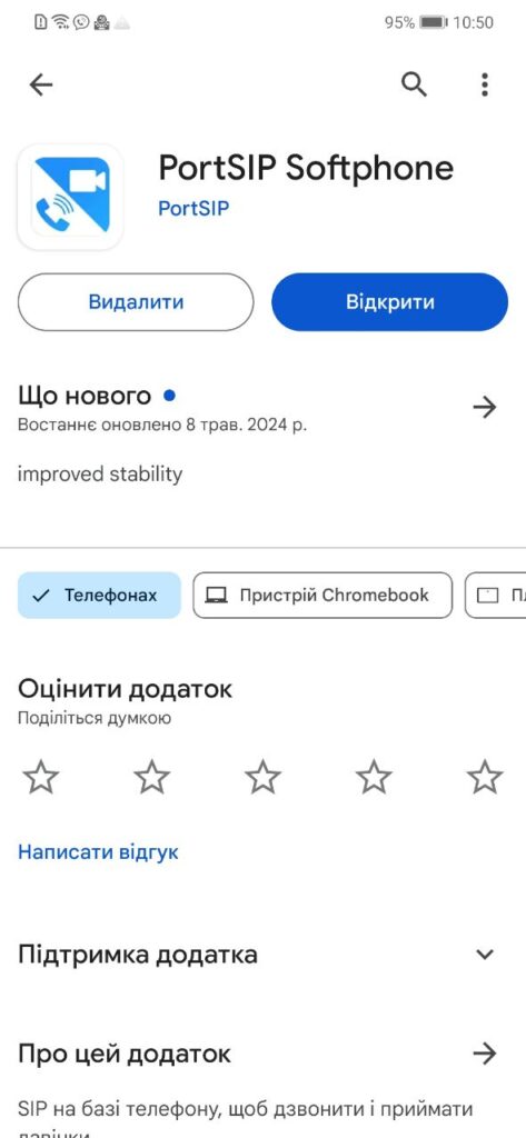 1. У магазині додатків GooglePlay знайдіть і встановіть додаток PortSIP.