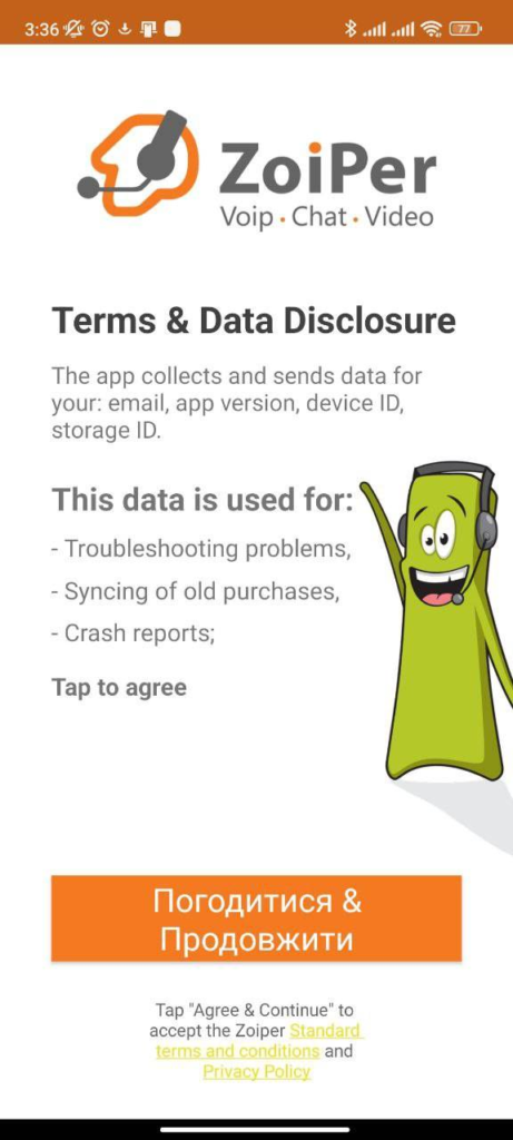 2. Увійдіть в додаток, натисніть кнопку “Погодитися та продовжити”.