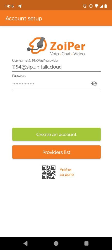 5. Введіть свій номер SIP-линії та пароль в відповідні поля. Цю інформацію можна отримати в особистому кабінеті на вкладці “Користувачі” (щоб скопіювати пароль, потрібно натиснути на нижню кнопку “Налаштування”). Після цього натисніть “Створити обліковий запис” / “Create an account”.