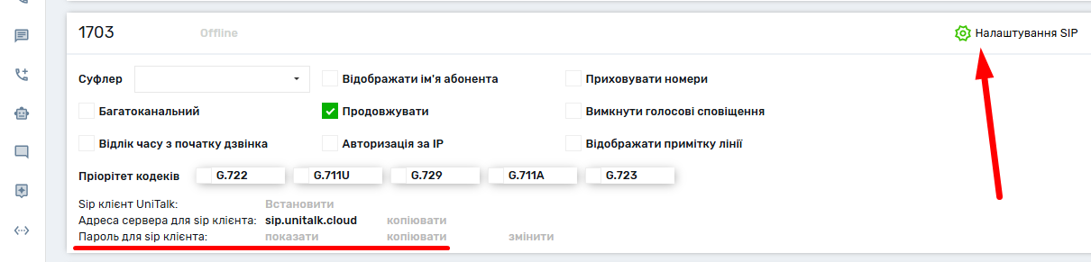 Для продовження потрібно мати логін та пароль для внутрішньої лінії. Цю інформацію можна отримати в особистому кабінеті користувача на вкладці “Користувачі” у розділі “Налаштування”.