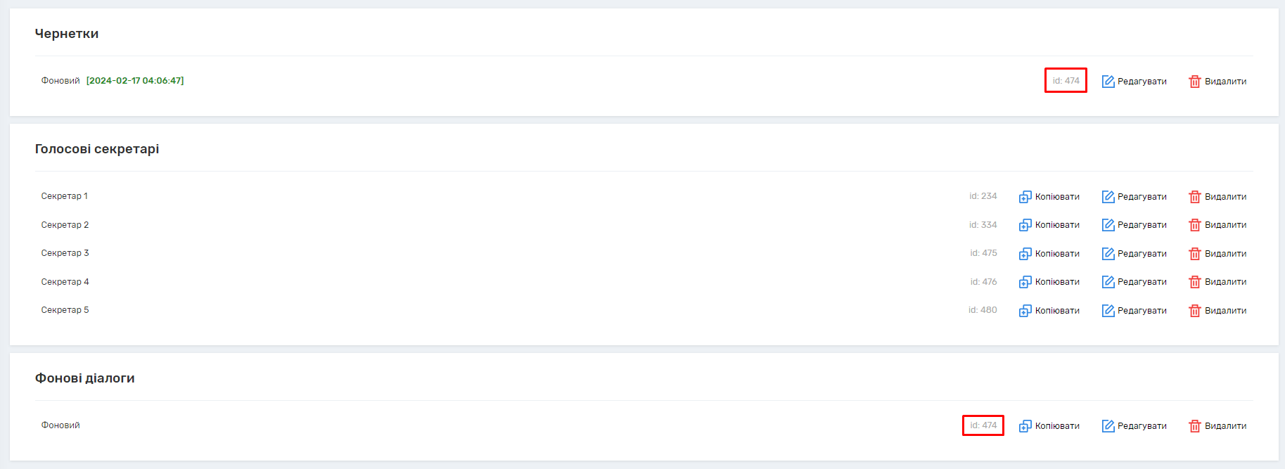 На сторінці голосових роботів можна видаляти та переглядати чернетки. У кожній чернетці відображається id робота, до якого вона відноситься. Якщо id=0, ця чернетка робота, який ще не був збережений та не отримав id.