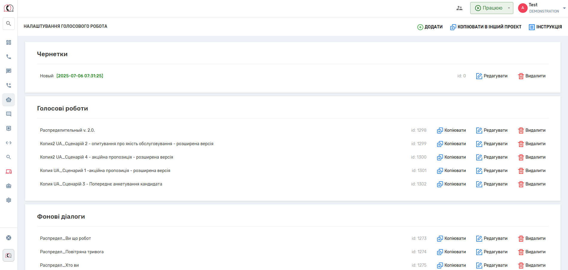 Сторінка Голосових роботів виглядає так: